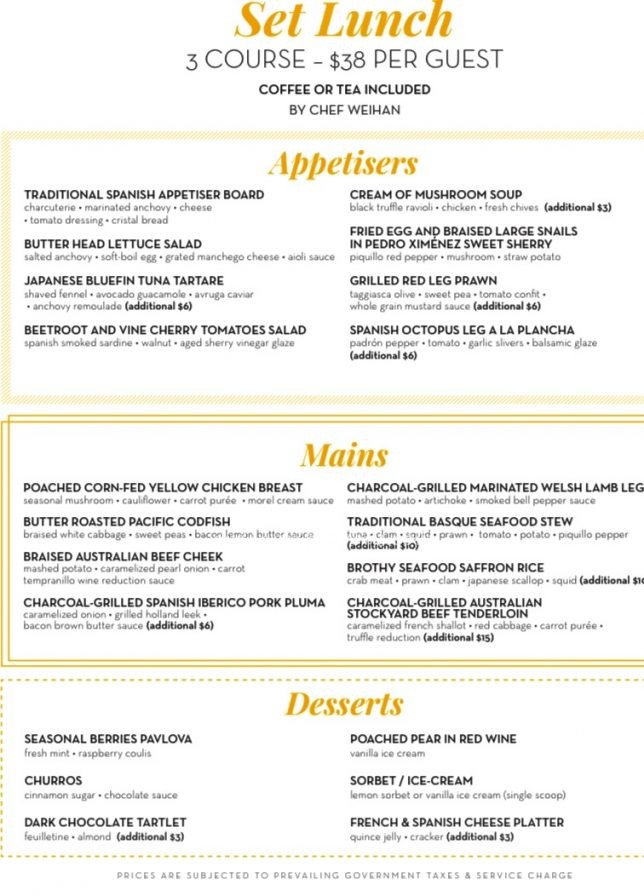 Here are pictures of the La Taperia set lunch menu and a few sample pages from the wine list. The set lunch costs $38++ per person with surcharges for some of the courses.