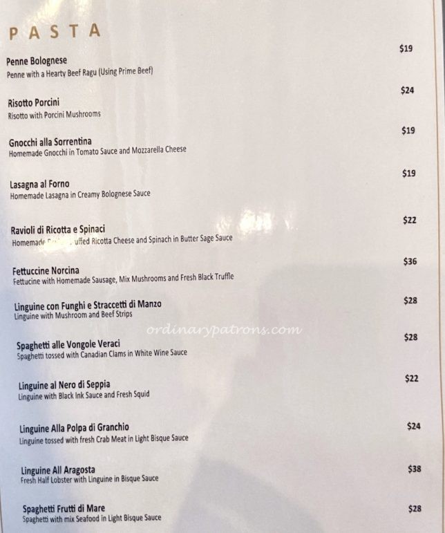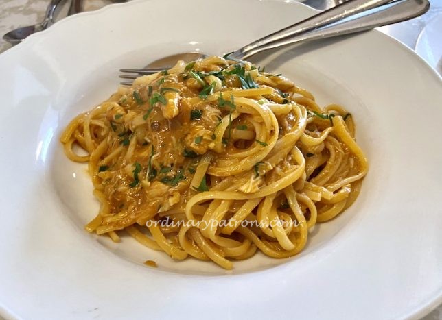Our final dish was linguine tossed with crab meat with light bisque sauce ($25.68 delivery price). It was a very good pasta with a complex seafood sauce. It is a more fragile dish than the other two and we fear it may not do so well as a takeaway, unless the trip is quite short.