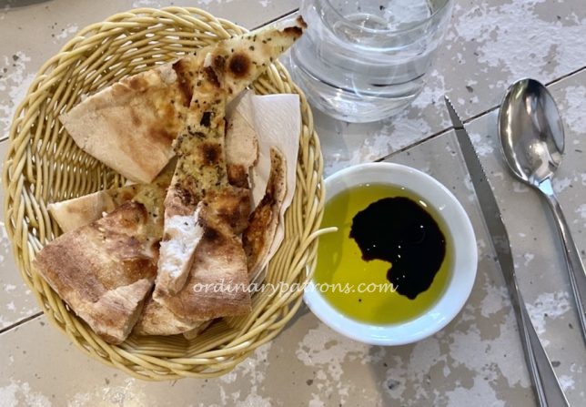 The bread served at the start of the meal made a good first impression. Like a cross between naan and pizza crust, it was toasty yet chewy. It went very well with the olive oil and vinegar.