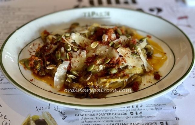 Our last item of brunch at Tapas 24 Singapore was from the “Chef’s Selection” part of the menu. We had mixed feelings about the Josper roasted eggplant with cured sausage ($12). The eggplant itself was very good – cooked till it was soft and creamy. But we found the flavouring (the saltiness and the strong cheese) a tad strong for us.