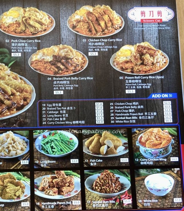 We think the humble scissor-cut curry rice may be most representative of Singapore’s multi-ethnic culture. A meal at 美芝律剪刀剪咖喱饭 Beach Road Scissor-Cut Curry Rice restaurant at Jalan Besar may perhaps be the most authentic way to experience the unique culinary heritage of Singapore. We have yet to eat at their Ion Orchard outlet, but you can read about our lunch at their Jalan Besar main branch here. These some pictures of the Jalan Besar restaurant and the food there.