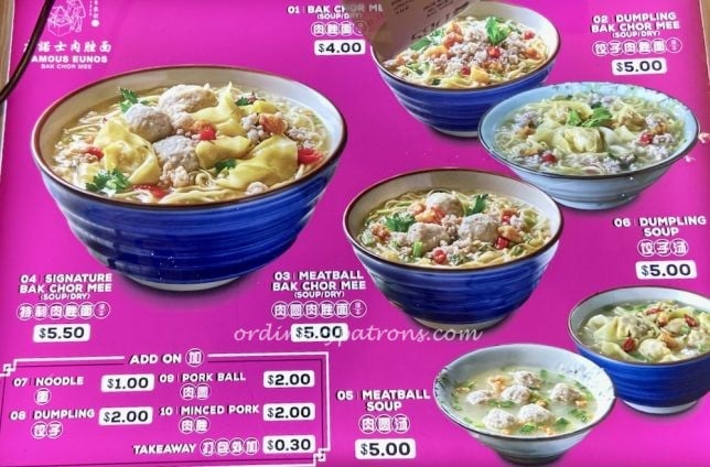 Famous Eunos Bak Chor Mee is also a stall with many followers, especially in the East, where they still have a stall in a coffeeshop in Eunos Crescent. This is a picture of the menu of Famous Eunos Bak Chor Mee at Ion Hawker Street.