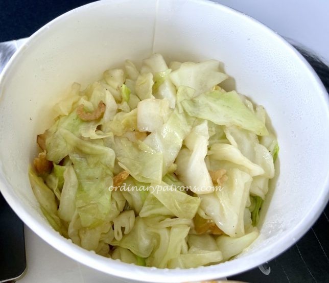 Cabbage with stir-fried dried shrimp was our final dish. We ordered it because it was indicated as a starred popular dish on the menu and to provide a contrast to the meat dishes. It had a good taste – the sweetness of cabbage balanced with the complexity of dried shrimp (‘hae bee’) and garlic. It was relatively expensive, almost the same price as the rice. But we would order it again as the added variety of flavours made the lunch more interesting.