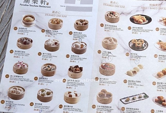 Here are pictures of the Paradise Teochew Takashimaya dim sum menu. We ordered a few items of dim sum and also a steamed marble goby (soon hock) fish.