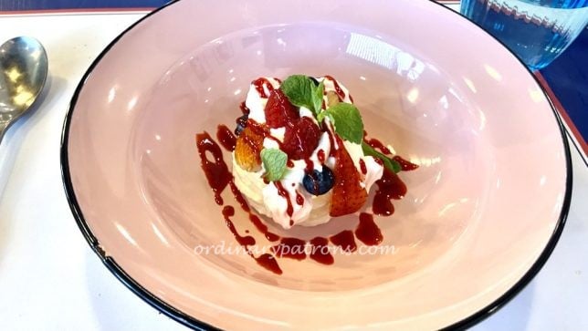 We tried the dessert of the day. It was a large scoop of cream with pieces of meringue inside. It was mostly sweet and pretty looking.