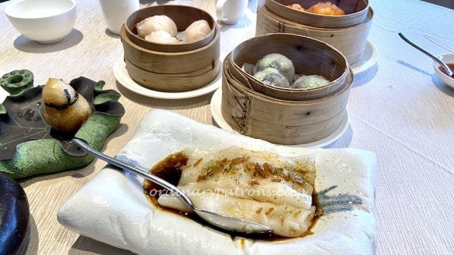 The steamed dim sum items looked and tasted more conventional. They were mostly served in bamboo baskets, except the cheong fun – rice roll with prawns ($7.80) which arrived on a ‘pillow’. We love the presentation.