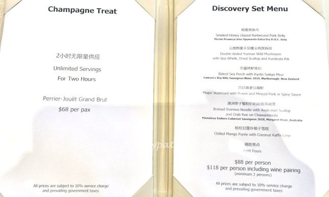 For those who would like a long leisurely lunch, there are set menus available. The Peach Blossoms Discovery Set Menu looked the most appealing to us. We have it on our to-do list. The Champagne Treat option will be appealing to our intoxicated friends. Free flow of Perrier Jouet champagne for 2 hours for $68++.