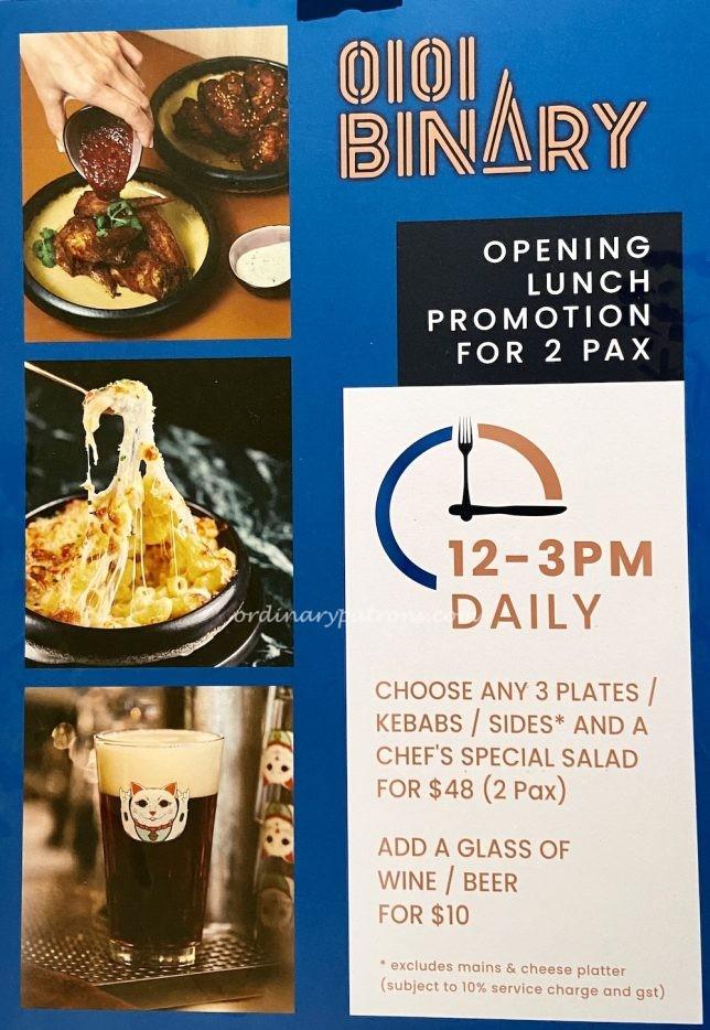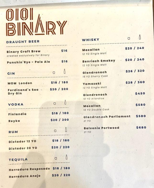 Here are pictures of the Binary food menu as well as part of the drinks menu. Binary has been described as a gastro-bar based on the concept of two in that it takes a binary approach to cuisine with each ingredient being offered in two ways : “… go East or go West as your palate brings you”.