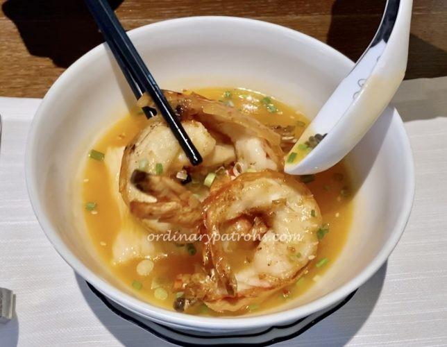 For main course, there was a choice of “Steamed Vermicelli, Fresh Prawn, Egg White, Lobster Broth” and “Steamed Glutinous Rice, Fresh Prawn, Wrapped in Lotus Leaf“. The star of these dishes were the fresh prawns which were some of the best we have eaten in recent times. The prawns had been grilled and produced a smoky grilled seafood taste. The glutinous rice version was our preferred version as the purity of the prawn taste was more pronounced.