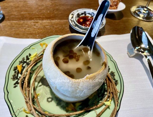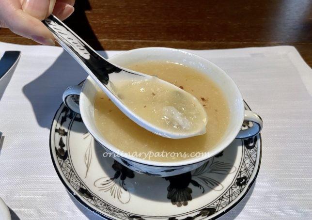 Our second course at the Summer Pavilion Singapore lunch was soup. There were two choices: “Doubled Boiled Sea Whelk Soup, Soaked Nostoc Algae, Chicken, Served in Whole Coconut” and “Braised Birdโs Nest Soup“.