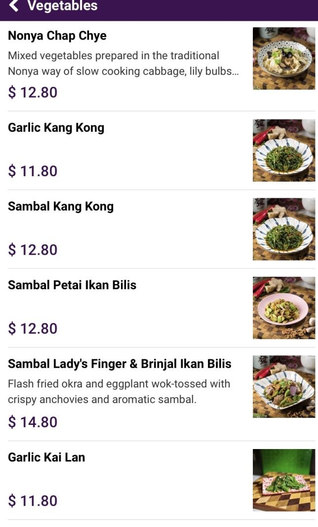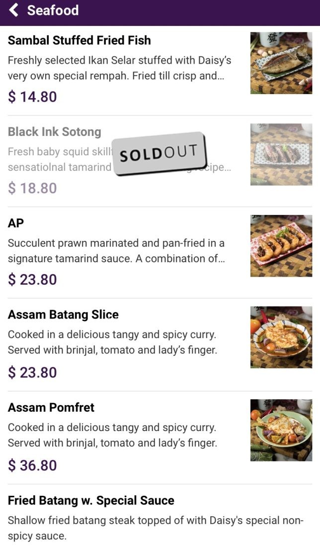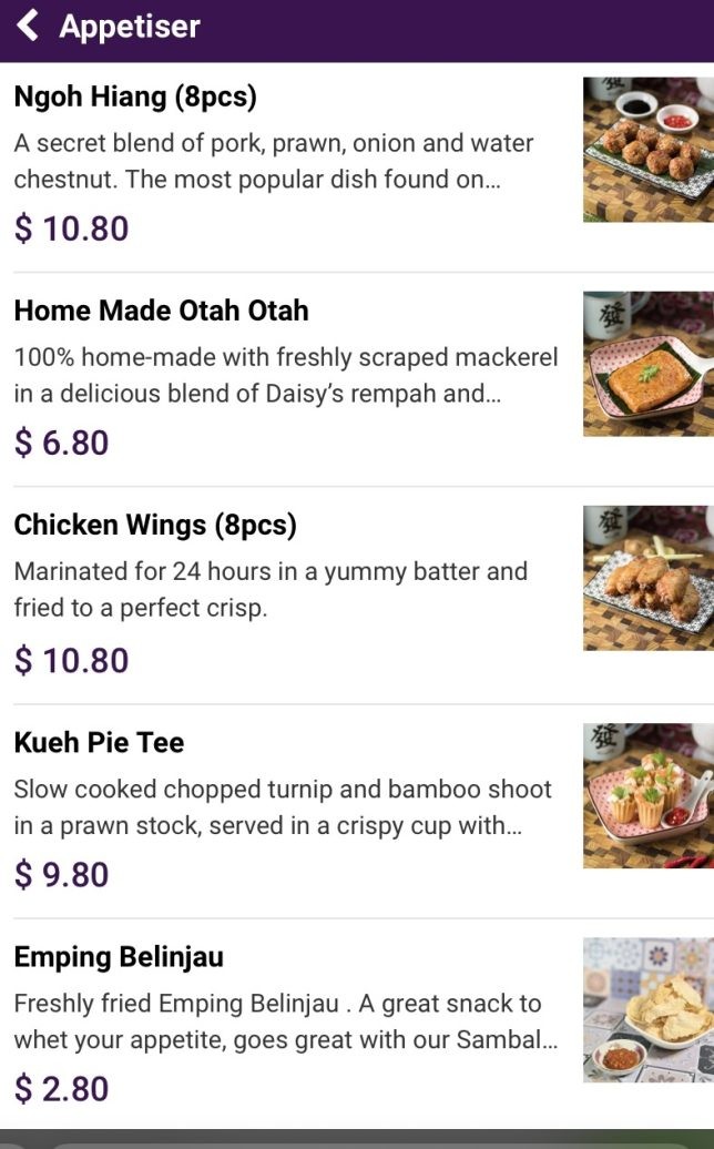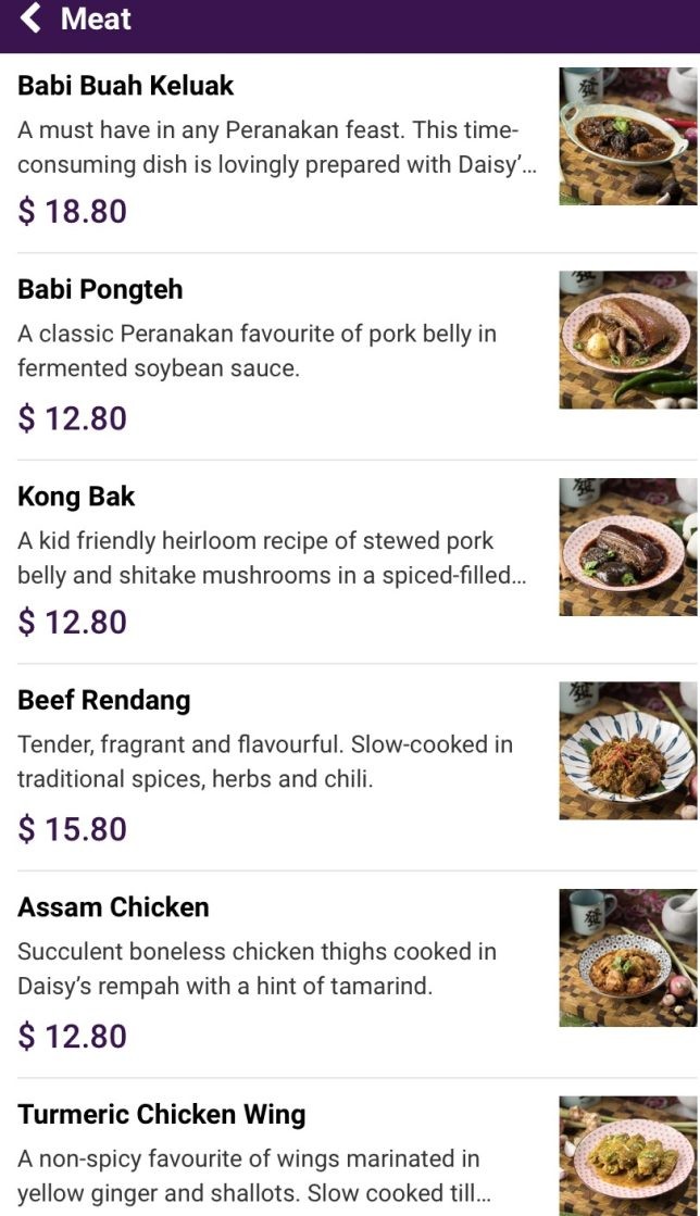 Here are sample screen shots of some pages from the Daisy’s Dream Kitchen menu. It is an extensive menu that contains many of the dishes that we commonly order at Singapore Peranakan restaurants.