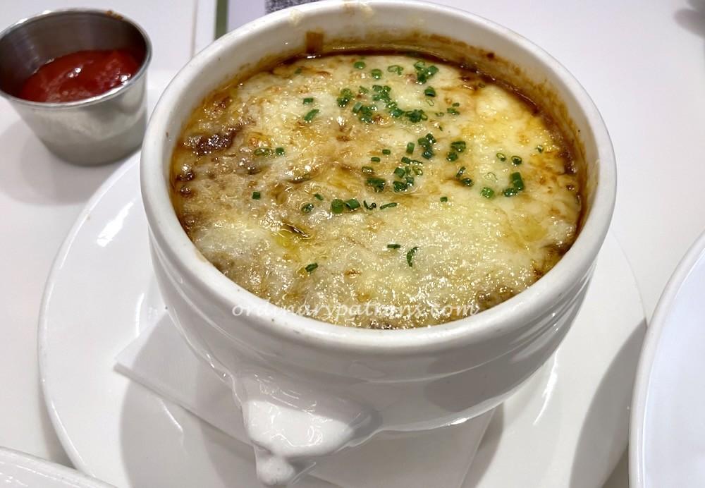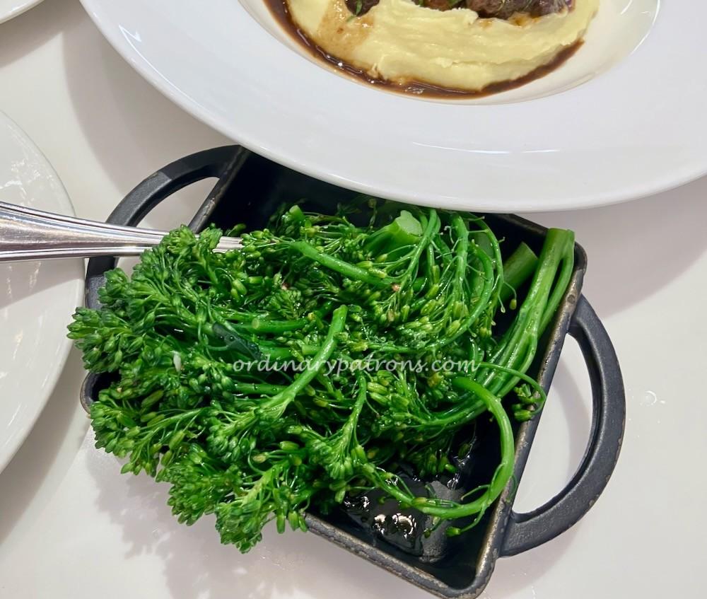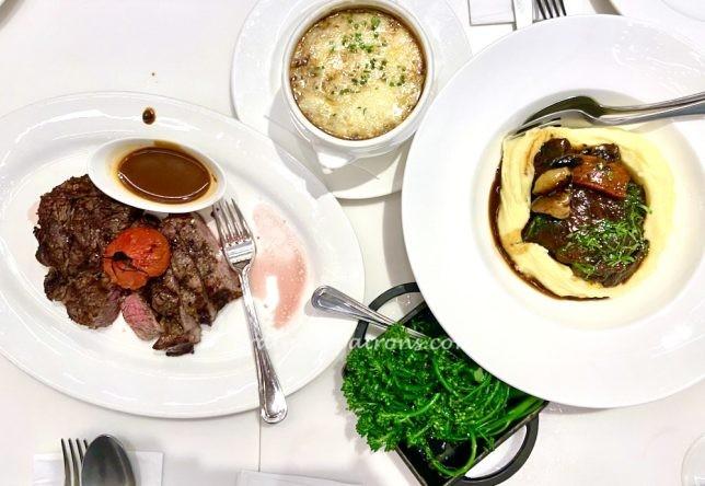 The steak comes on its own without any sides which have to be ordered separately. We tried the shoestring fries ($12), steamed broccolini ($12) and French onion soup ($18).