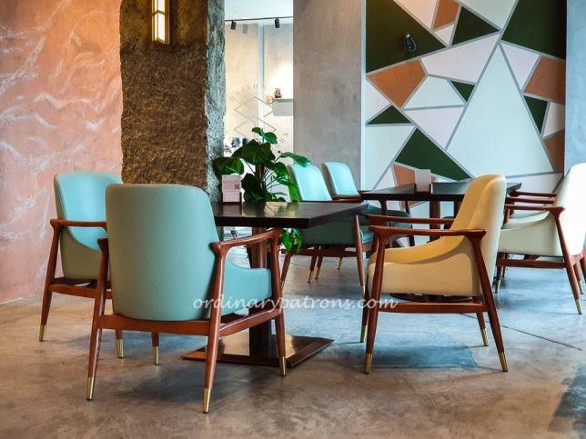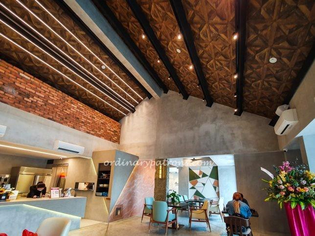 The new Ms Durian has a stylish interior design. The pitch roof with motifs creates architectural interest. Exposed bricks and bare concrete are complemented by pastel hues. The place has character and charm.