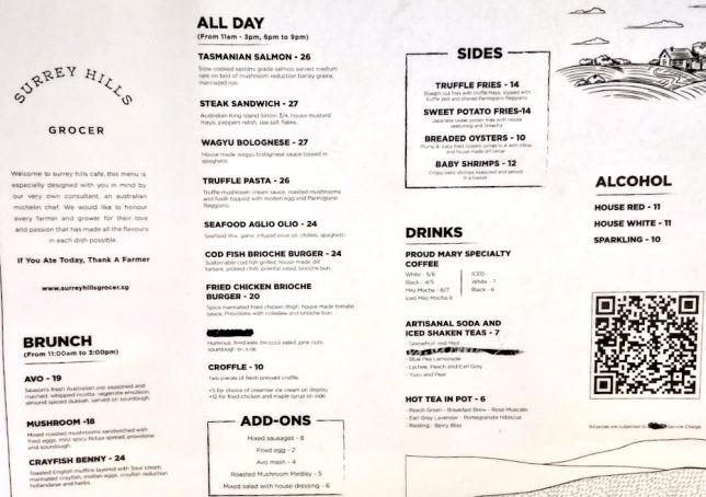 Here is a picture of the Surrey Hills Grocer cafe menu. It is a short menu containing some cafe food staples such as sandwich, burgers and pasta. They serve Proud Mary coffee which, I understand, is famous and well-regarded Down Under.