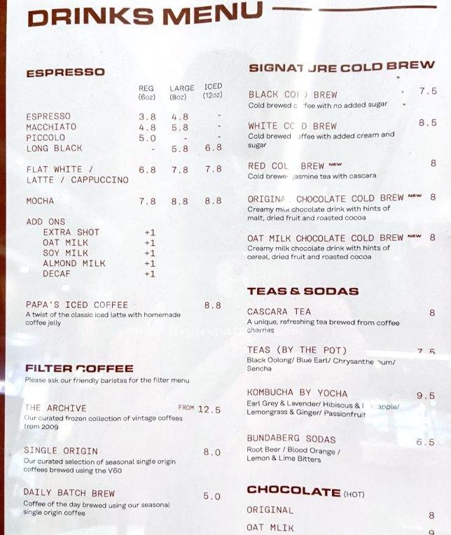 Here is a picture of the drinks menu at PPP Coffee. Espress and filter coffee, cold brews, teas and sodas are available. A separate list of single origin beans for filter coffee is available. We decided to try the Muchagara Kenya and Suke Quto Ethiopia filter coffee ($8 each) and a cup of cappuccino ($6.80).