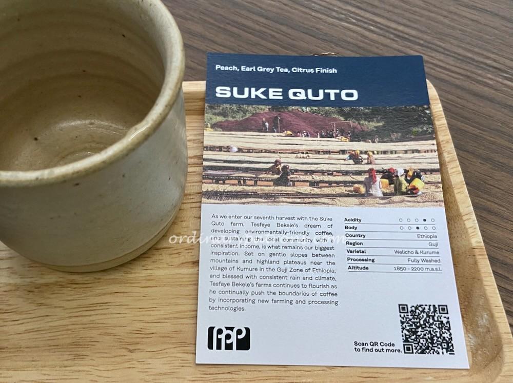 Our other filter coffee, made with Suke Auto beans, was a stronger coffee. It is described as having flavours of peach, Earl Grey tea, and citrus finish. It did remind us of tea but there was not much fruitiness. My filter coffee companions preferred the other filter coffee.