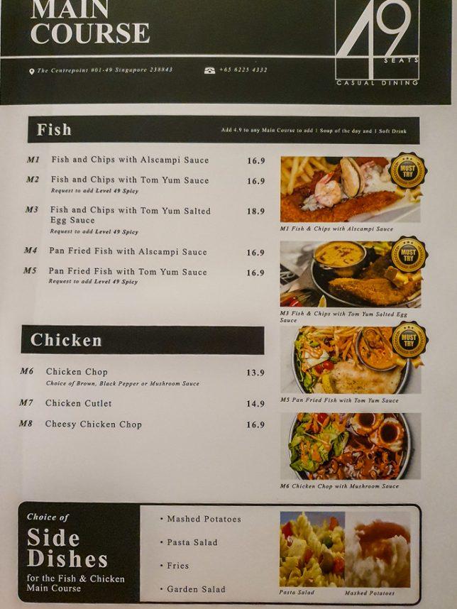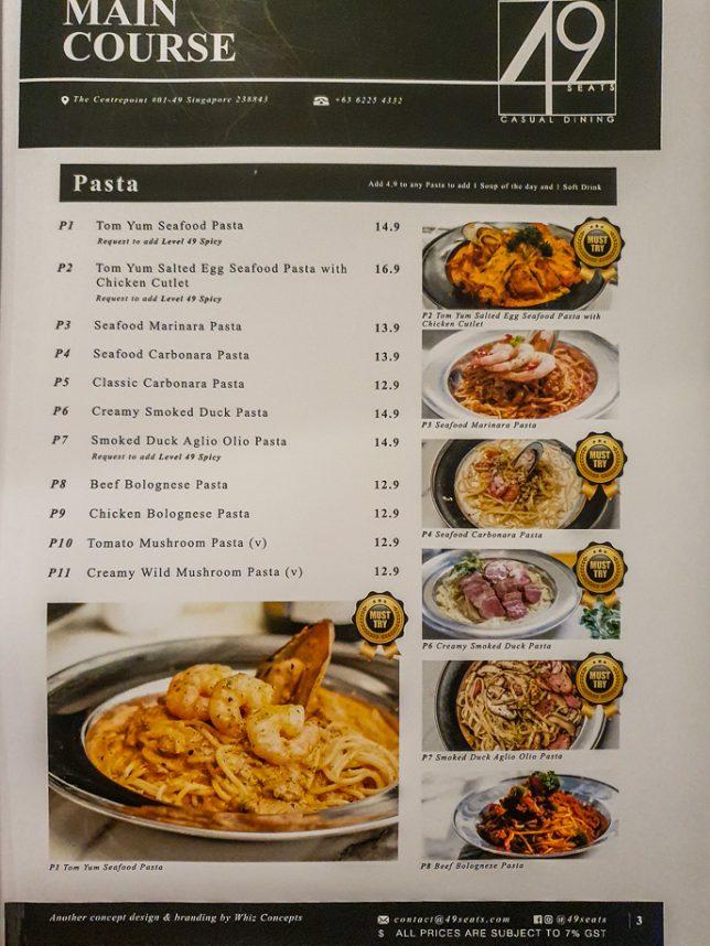 49 Seats is a local restaurant known for its affordable fusion style dishes such as Tom Yam Seafood Pasta and Salted Egg Popcorn Chicken. The restaurant first opened in Kreta Ayer Road with a seating capacity of … as you might have guessed, 49 seats. It now occupies a large space on level 1 of the rear wing at The Centrepoint that can accommodate many more than 49 diners. However, there is still a connection to the number 49 – it is located at unit #01-49 of The Centrepoint.