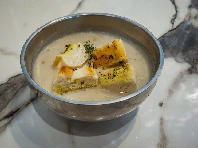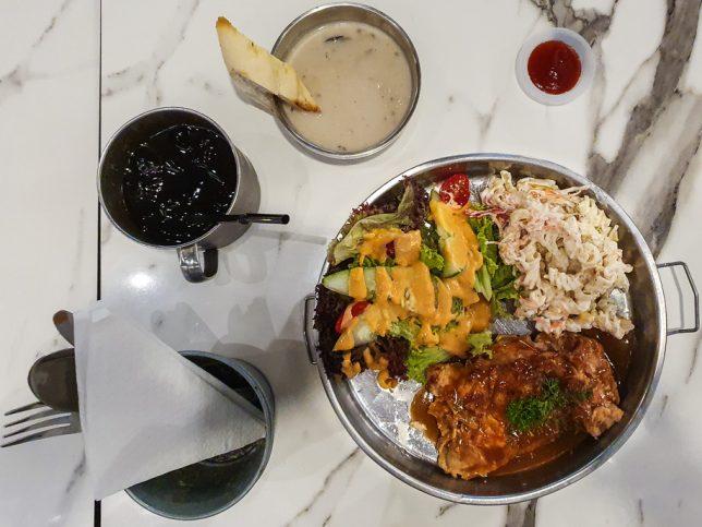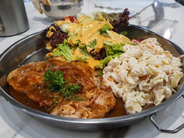 For our chicken chop, we opted for brown sauce for the chicken and garden salad and pasta salad as our sides. The soup of the day was cream of mushroom, which was served with garlic bread.