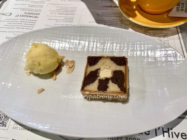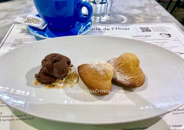 Our choices of desserts were freshly made madeleines with chocolate ice cream (picture above) and chocolate peanut marble cake. The presentation of the desserts look like how we would plate our desserts at home. The madeleines were a better choice – they were light and had nice flavours.
