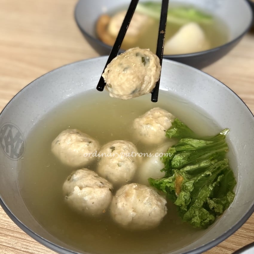 The signature Hakka noodles set is a combination of noodles served with a bowl of Hakka yong tau foo (picture left below). It made us think of visiting Plum Village (said to be Singapore’s oldest Hakka restaurant) again. It was a nice set of Hakka YTF but not as memorable as the noodles. Our extra order of fishball soup (picture below right) was prepared (I believe) in the same soy bean based soup. Pleasant but not exceptional.