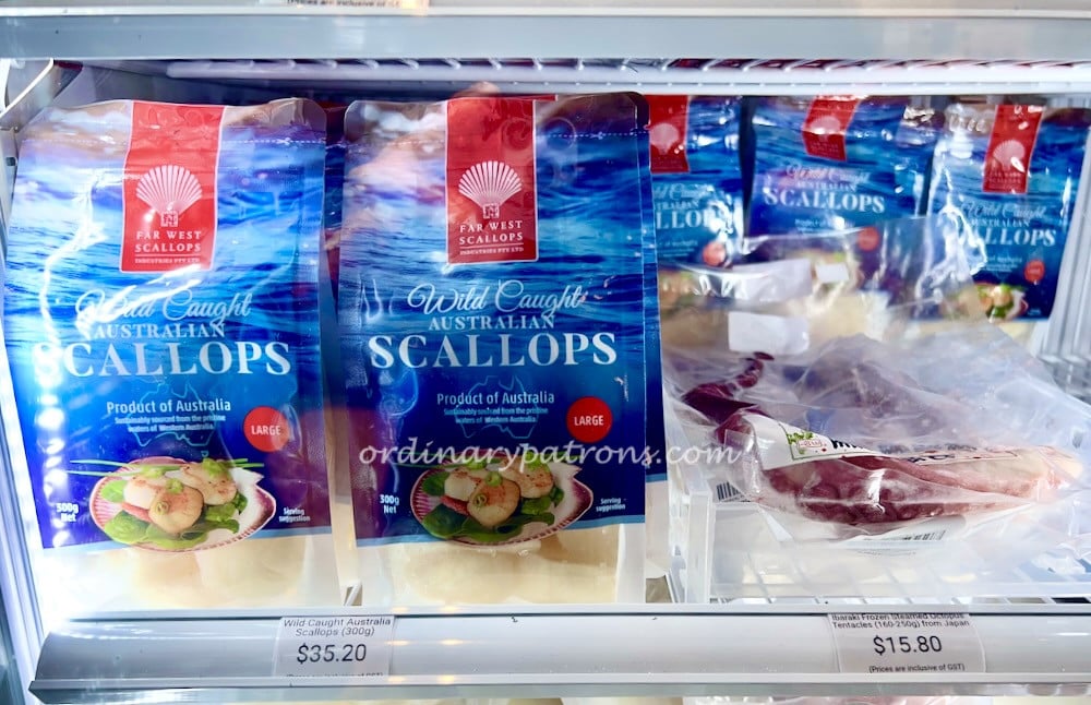 The items that caught our attention were these wild caught Australian scallops and the frozen bread. We took a picture of the frozen bread baking instructions for future reference.