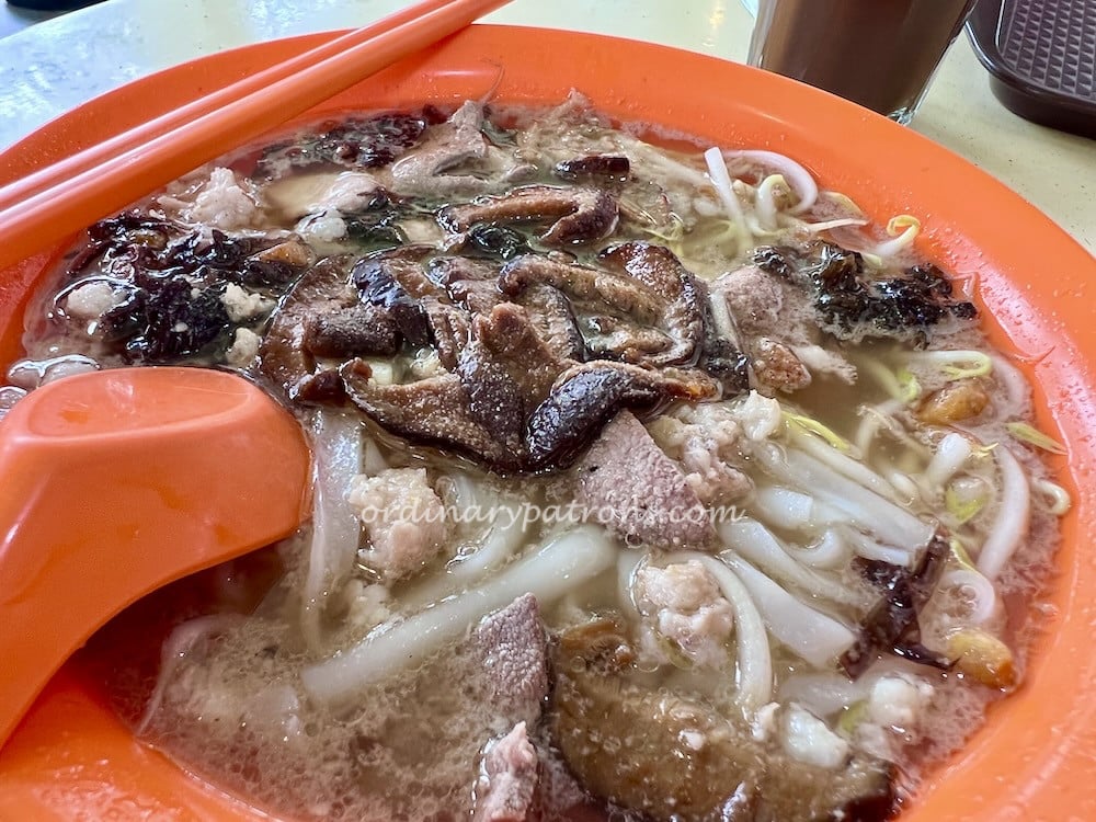 The Lai Heng Mushroom Minced Meat Noodle stall was a busy place with a few people attending to the customers. Ordering was easy as the choice of food was limited to selecting the type of noodles, the size ($5, $6 or $7) and whether to have the noodles dry or with soup. We selected a kway teow soup and dry mee, both in a medium $6 size. Our first choice for dry noodle would have been mee pok, but it was sold out.