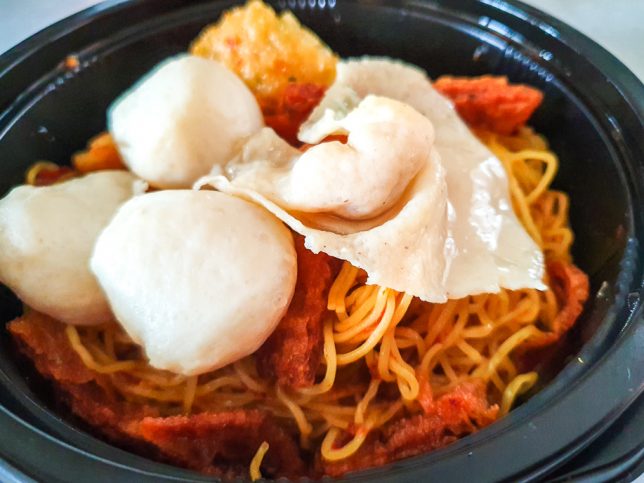 I ordered for takeaway the Signature with Fish Dumpling Noodle ($5.90) – one with mee pok and one with mee kia. The waiting time was fairly short – less than 10 minutes. The takeaway containers had 2 separate compartments – with the noodles on top and the soup with fishballs in the bottom compartment.