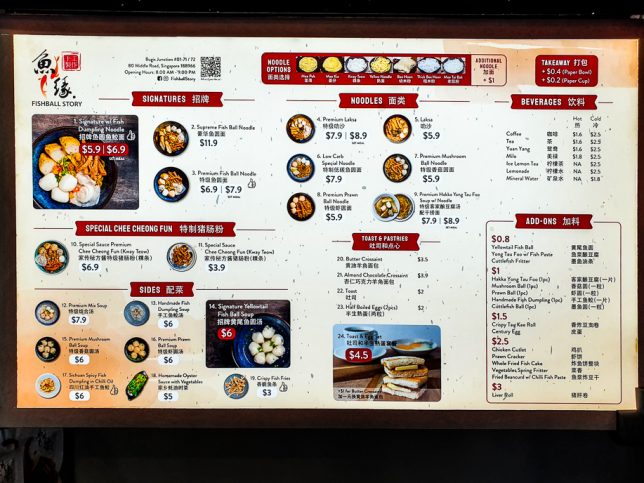 The signature dish is the fishball noodles featuring Douglas’ grandmother’s handmade fishballs. However, the menu of Fishball Story now also offers laksa, chee cheong fun and various side dishes. In addition, breakfast items like egg and toast are available. Below is a picture of the menu board of Fishball Story at Bugis Junction.