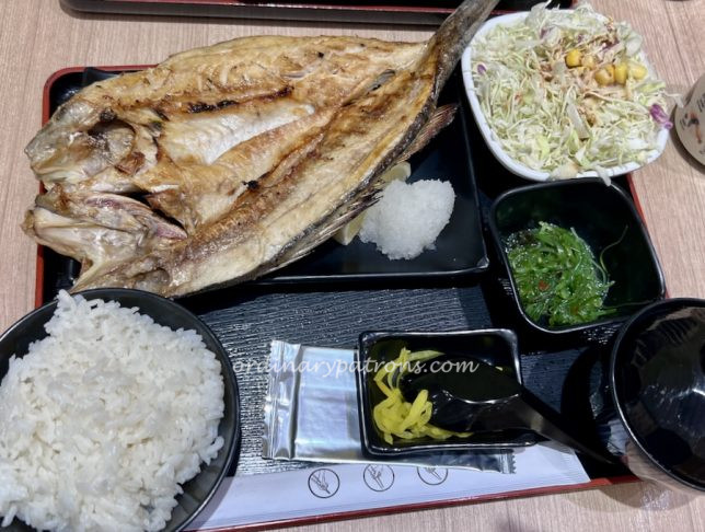 Here is a picture of a portion of the menu at Nakajima Suisan Grilled Fish Restaurant at Takashimaya food hall. A link to the online menu is provided below. There is an option of ordering the fish items a la carte or as a set meal. Most people (including us) will choose the latter which costs $2 more and includes rice, salad and miso soup. For this visit we selected the Hikari (Pacific Ocean perch) set ($20.50) and a Salmon Teriyaki Set ($13.50).