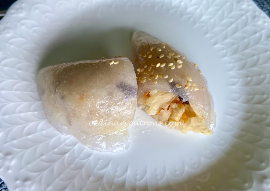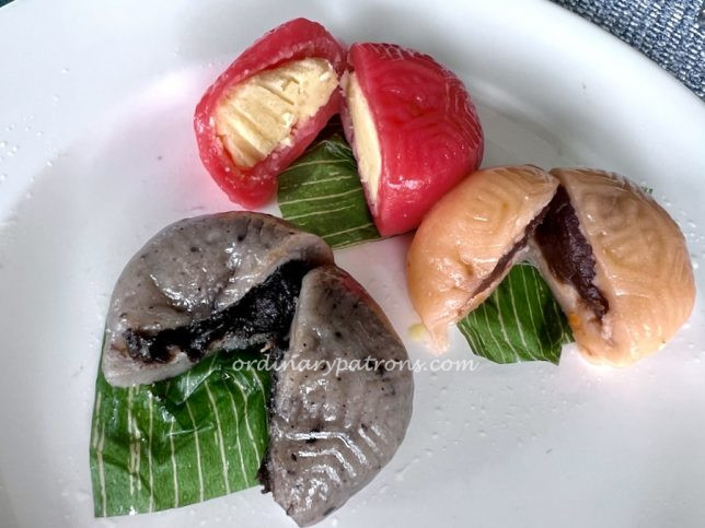 Out of the twelve available flavours, we selected three – green bean, black sesame and red bean. The one with the green bean filling is the classic ang ku kueh – its bright red colour and tortoise shell pattern giving it its name ็บข้พ็ฒฟin Teochew or Hokkien. Taste wise we thought that the fillings were the best part – generous and not too sweet. The skin was ok but slightly tough. We did not like the use of plastic sheets for the base instead of natural leaves. We would buy these again but only if there is not a long queue.