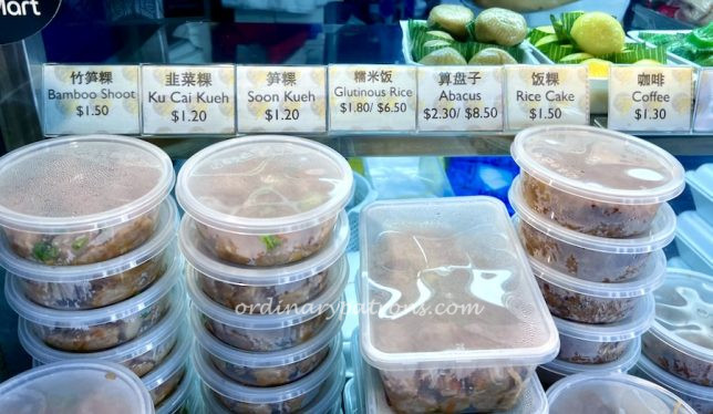 Conveniently for customers, the prices of the Poh Cheu AKKs and other snacks are clearly labelled at the display case. Traditional Teochew kuehs – koo chai and soon kueh cost $1.20 each. Rice cakes or poon kueh – $1.50.