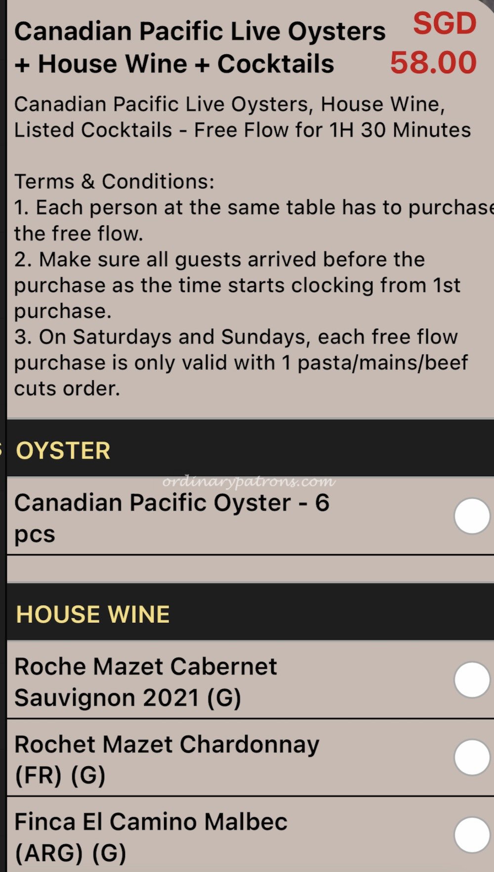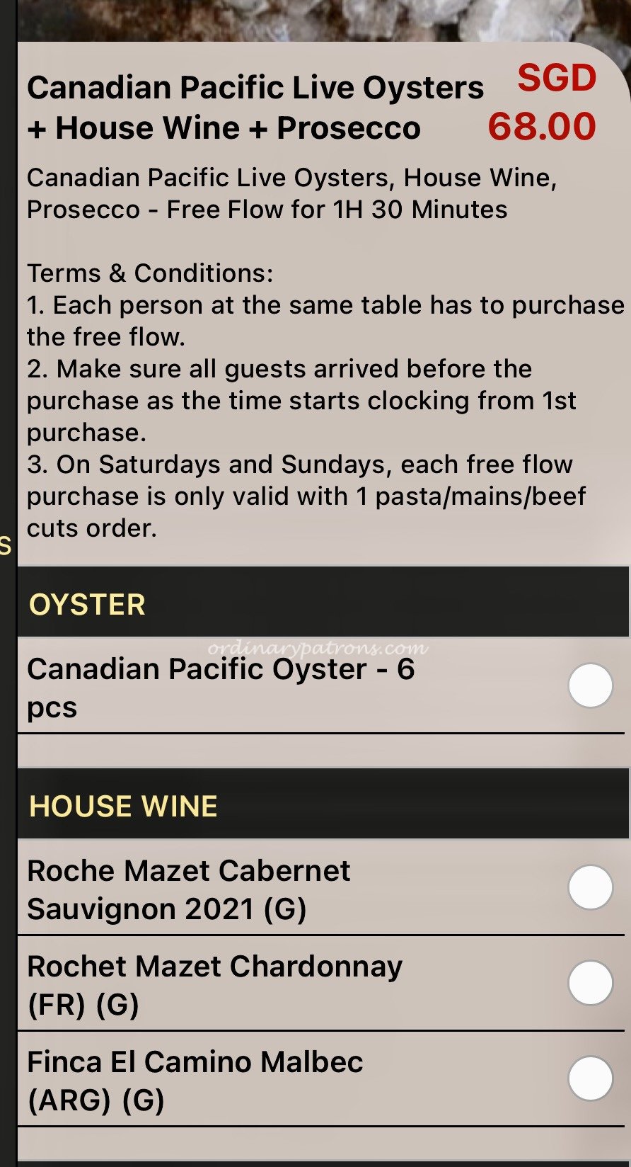 Since steak and oysters seem to continue to take centerstage, we highlight below the steak menu and an interesting deal for a free flow of oysters and wine. $58++ for wine and oysters over 1.5 hours sounds like a good deal for those who can handle a meal of raw seafood. Perhaps Zermatt can have a go at this place.