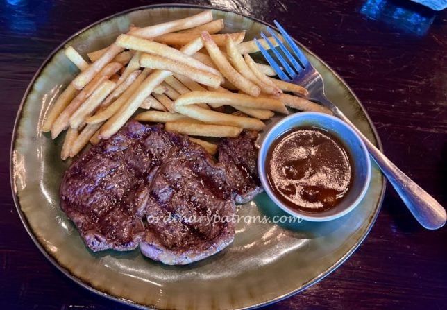 By comparison, the steak frites (fries with a small grass-fed ribeye steak) looked rather boring. In terms of taste it was not bad but our memories of the lunch was mostly about the fish and the prawns.