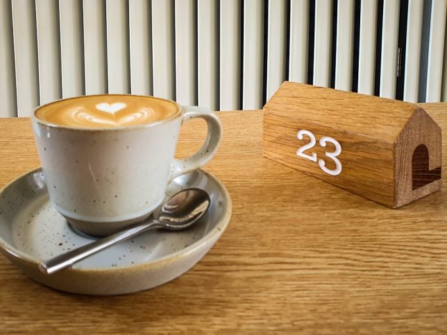 The simple, modern interior design creates a welcoming chic space. The front of the cafe is dominated by the display counter and the barista bar. There are shelves on the wall for retail items like food, beauty and wellbeing products.