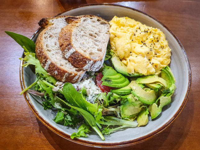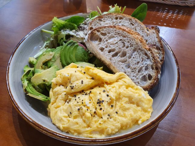 At La Levain, the Avocado Tartine was a deconstructed tartine or DIY tartine. There were sliced avocados and two slices of sourdough bread served with scrambled eggs and salad. Perhaps that way of presenting the dish was to allow us to savour the sourdough bread, which La Levain said was “leavened only using our own cultivated sourdough starter which contains lactobacilli and yeasts. This is also known as levain, a natural leavening agent traditionally used in France“. The sourdough bread had a tangy flavour, nice aroma and a pleasant chewiness. Overall, the dish was a fairly standard avocado toast or avocado tartine now found on the menus of many cafes in Singapore.