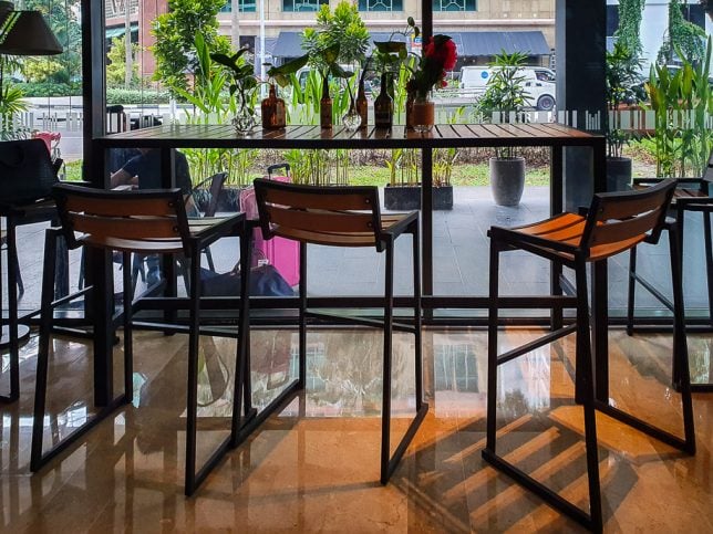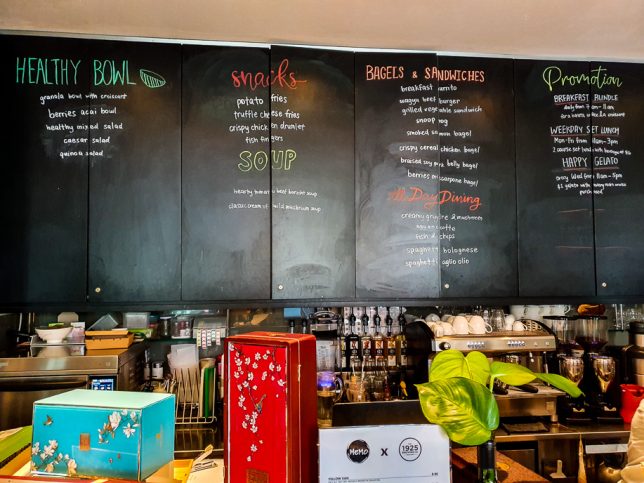 Greenery is the design theme of Memo Cafรฉ. The long and narrow interior has green plants on the floor, shelves, tables, wall and ceiling. It has a naturally ventilated dining area outside. The furniture is functional. Overvall, it is a pleasant casual dining space.
