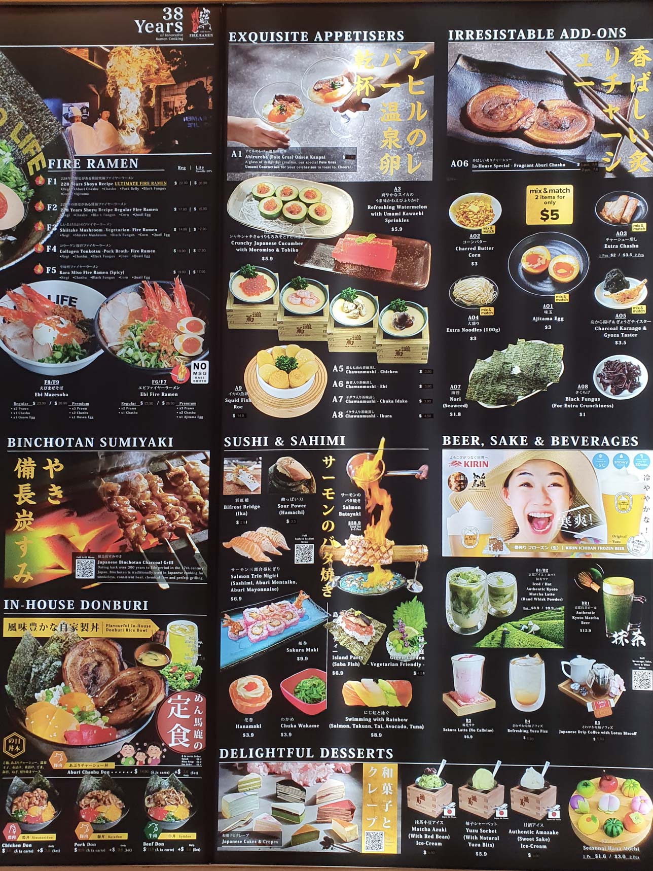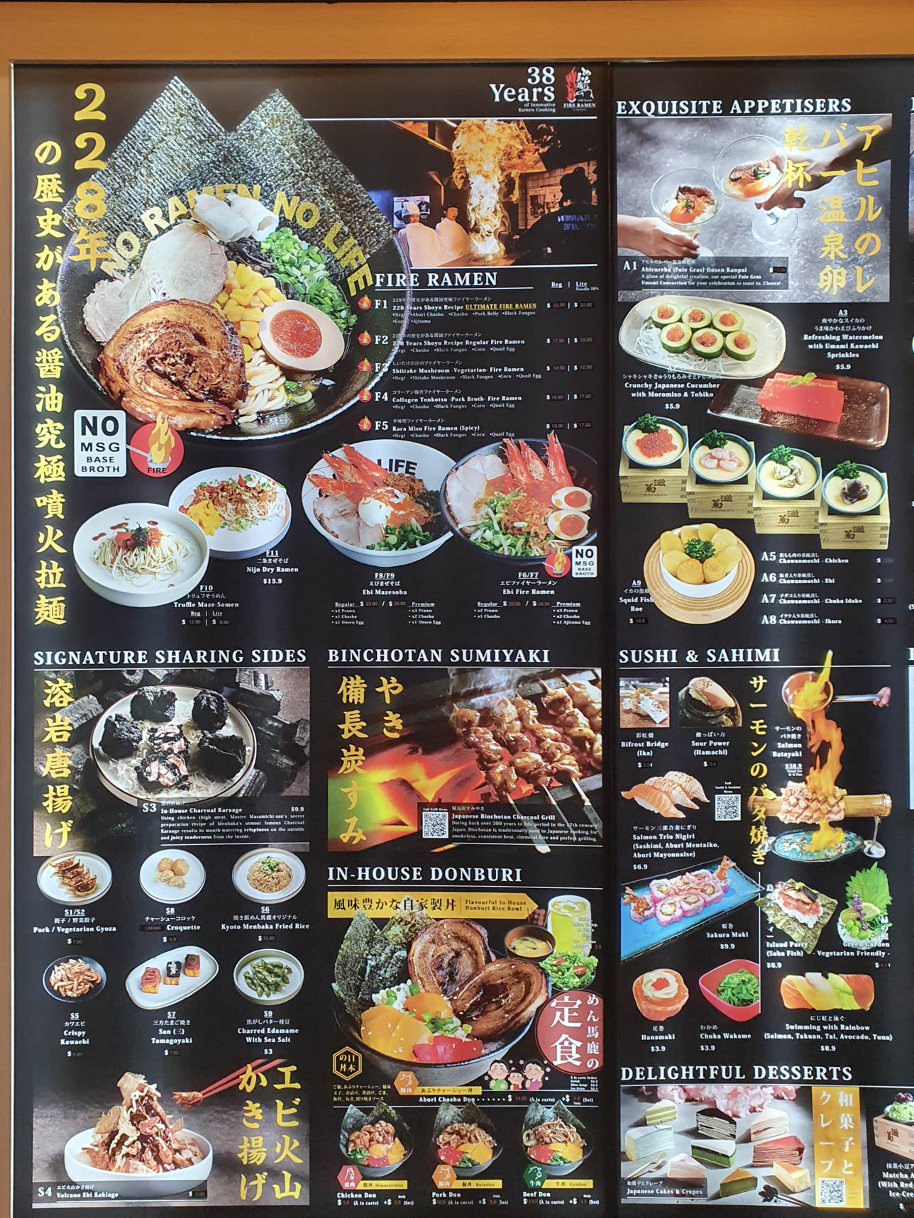 A Ramen restaurant known for its theatrical serving method โ where chefs ignite the oil to create tall, dramatic flames, and pour it over their signature broth covered with Negi. On its menu are also Don, Sushi, Sashimi, Sumiyaki-Charcoal Grill, desserts and a variety of side dishes.