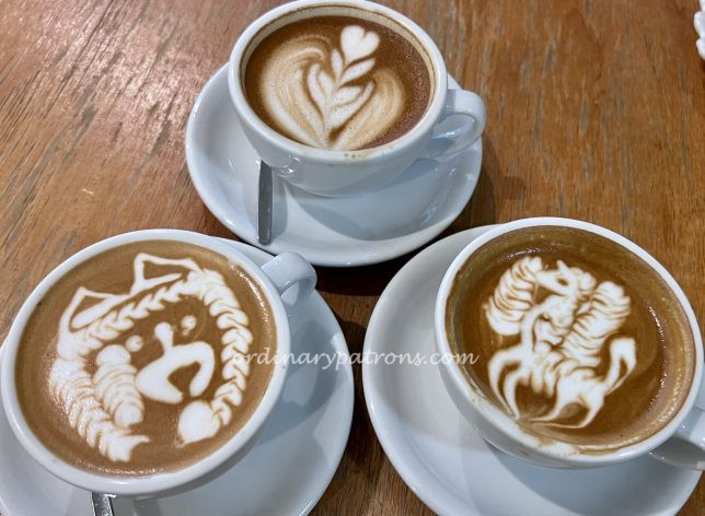 What was exceptional was the elaborate latte art that the barista produced. We are not sure what creatures they were supposed to be but dog barrister and winged horse came to mind. The coffee was above average in taste but the creative works of art etched in foamed milk made them more enjoyable!