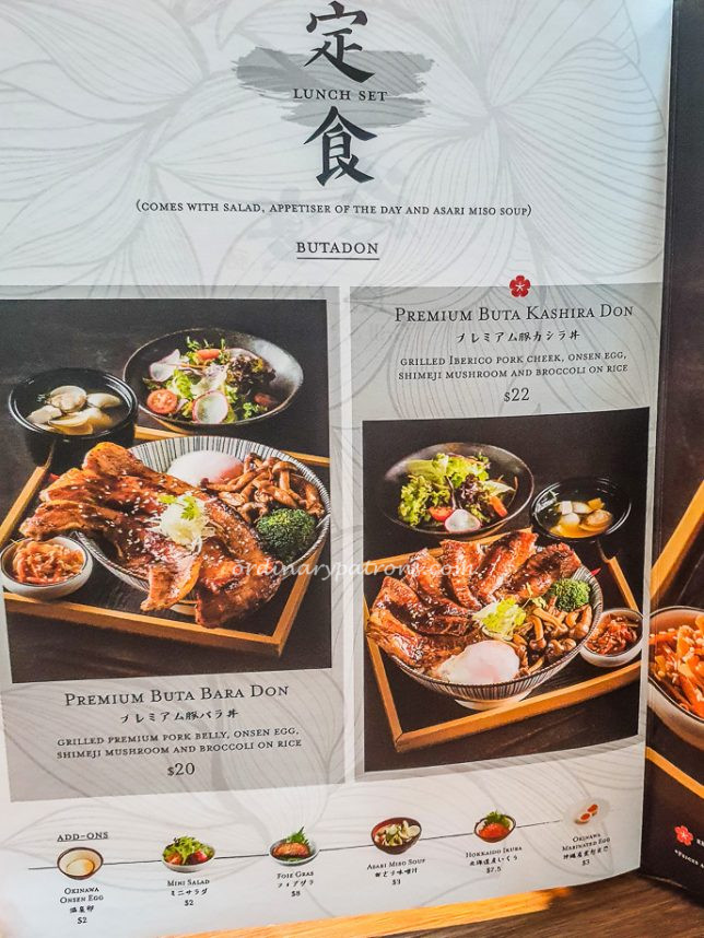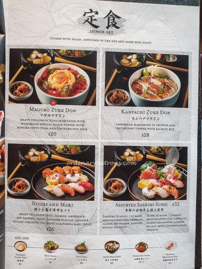 At lunchtime, the menu mainly contains rice bowls and set lunch combinations. For dinner, pricier choices are available in the a la carte menu including sashimi and grilled premium meats. Here are pictures of some pages of the lunch menu that we tried that day.