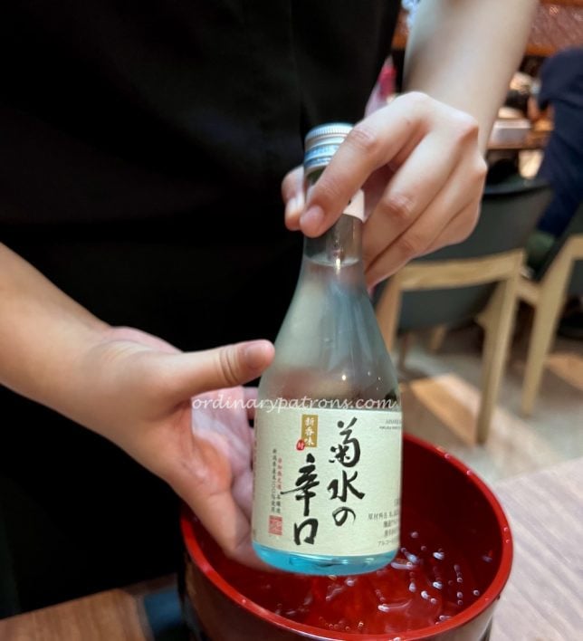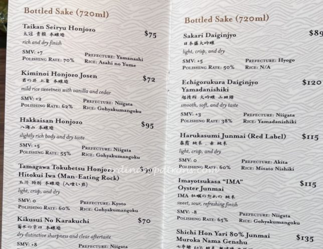 We tried a Kikusui No Karakuchi ($33 for 300ml). It is described as having a dry distinctive sharpness and clear aftertaste. We thought that it was a pleasant sake to go with our food on that day.