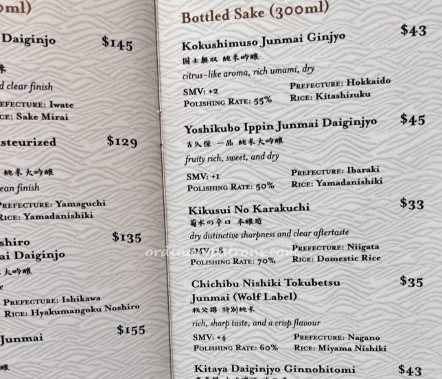 A wide range of Japanese sake is listed in the Ka-En wine list – by glass, full bottles(720ml) and half bottles (300ml). Here are some sample pictures of the sake menu.