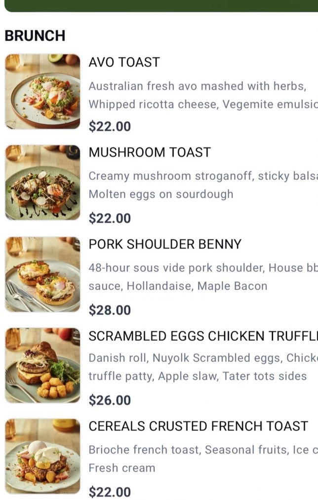 Here are pictures of some portions of the menu. We decided to try a mushroom toast ($22) from brunch section, a Tassie steak sandwich ($30) from the Chef Recommendation with a potato and avocado side add-on ($8).