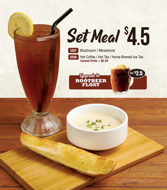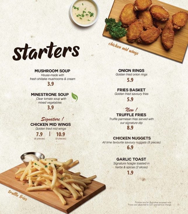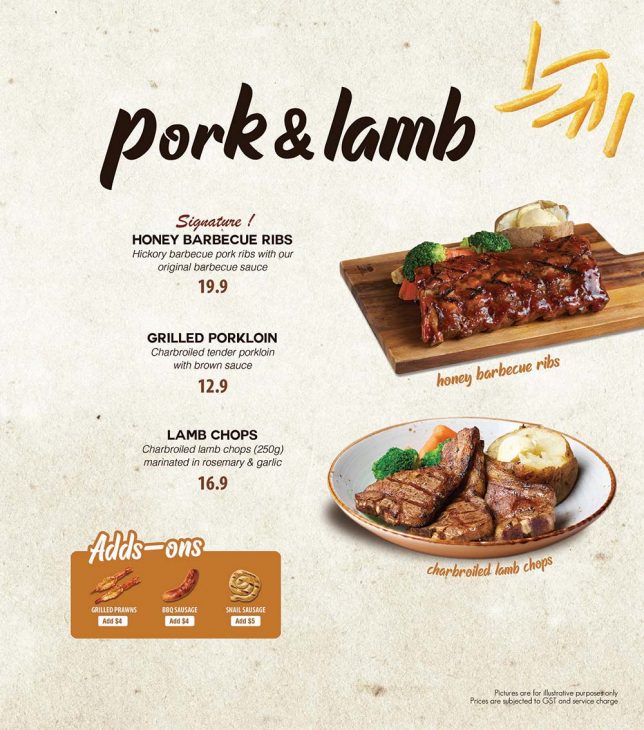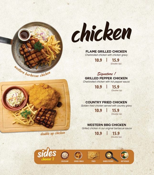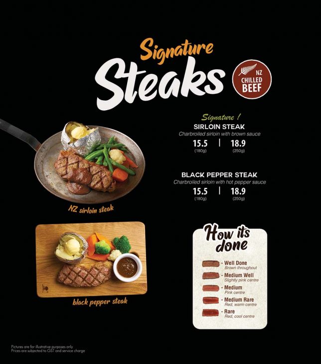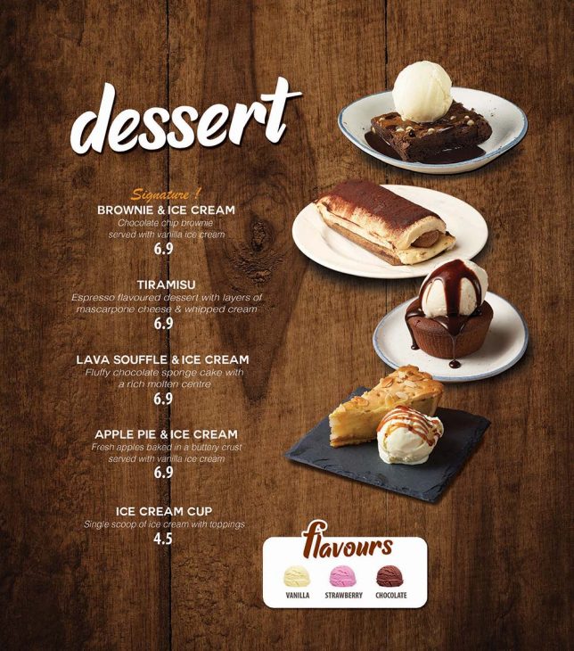 The menu is quite extensive. There are chicken, fish, steaks, pork and lamb prepared in a variety of styles. Pasta, pizza, sandwiches, baked rice and rosti are also available. Desserts will include Lava Souffle and Brownie & Ice Cream. The selection of beverages includes coffee, floats, beer and wine.