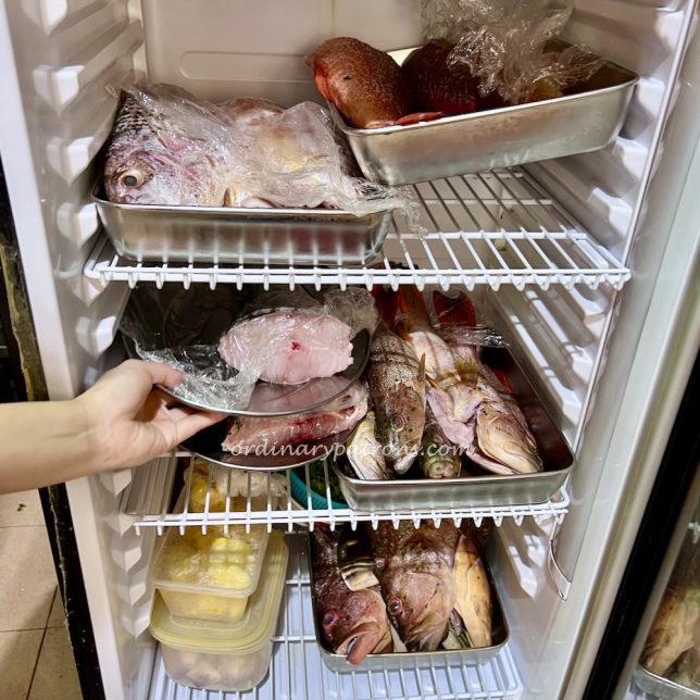 On the right side of the stall is a tall narrow fridge. Here, you can check out the types of fishes that are available on that day. Premium fishes like red grouper and pomfret as well as some smaller fishes I cannot identify are available. Big fishes had been cut into heads, fillets and tails. Fish heads are too complicated for us and are best left to the fish experts. A tail portion of red grouper was proposed to us. The price was $45 – not bad for quite a large portion of fresh fish.