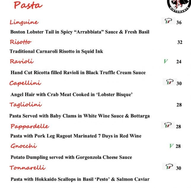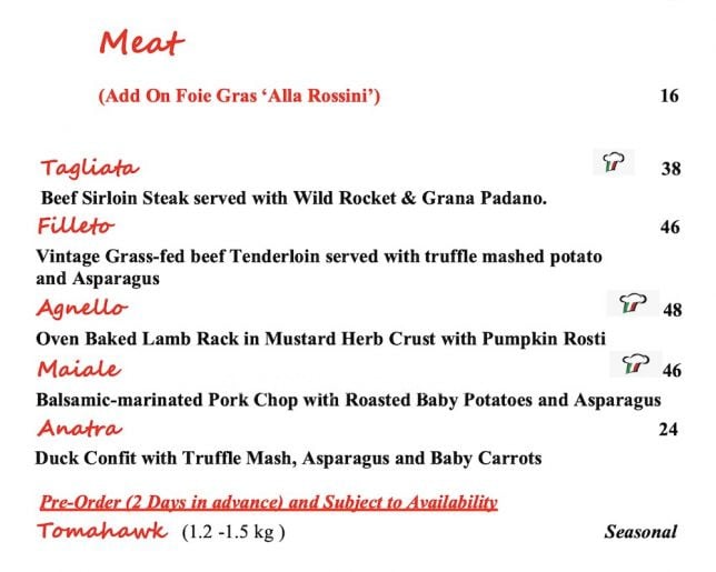 The restaurant menu is available online. Here are some sample pages of the menu for a quick reference. We selected the Fritto Misto (deep-fried seafood, $28), Paparedelle (pasta with pork leg ragout marinated in red wine $28) and Maiale (pork chop, $46)