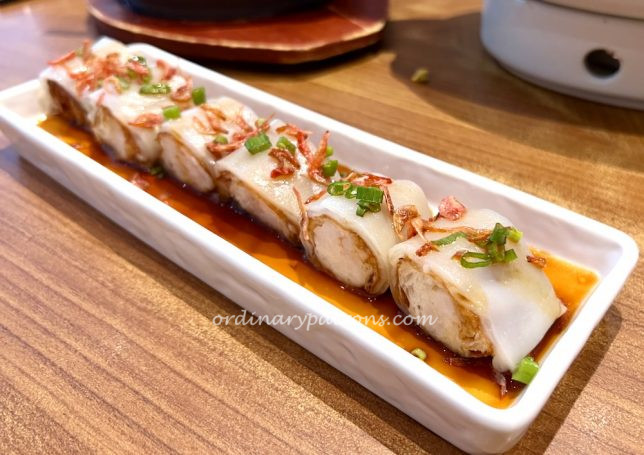Steamed Scallop Dumpling which had caviar and sparkling gold flakes is probably considered an auspicious dish. A more humble dim sum dish was the Steamed Rice Flour Roll, Crispy Dough Stuffed with Prawn Paste (picture below, right). It did not have any fancy ingredients but we thought it was the best dim sum item.