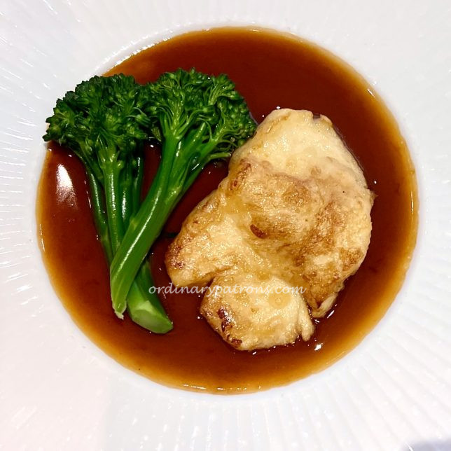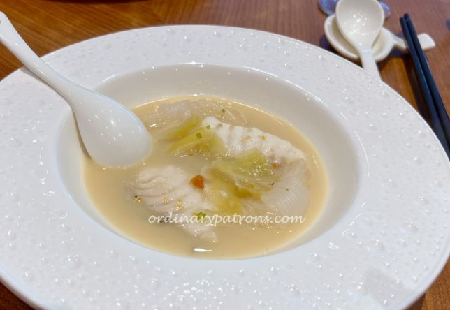 Poached Dragon Tiger Garoupa Fillet, Salted Mustard Green – $22 Chef Recommendation. Fresh fish slices in a tasty broth. A healthy and light dish. Our Score 3/5.