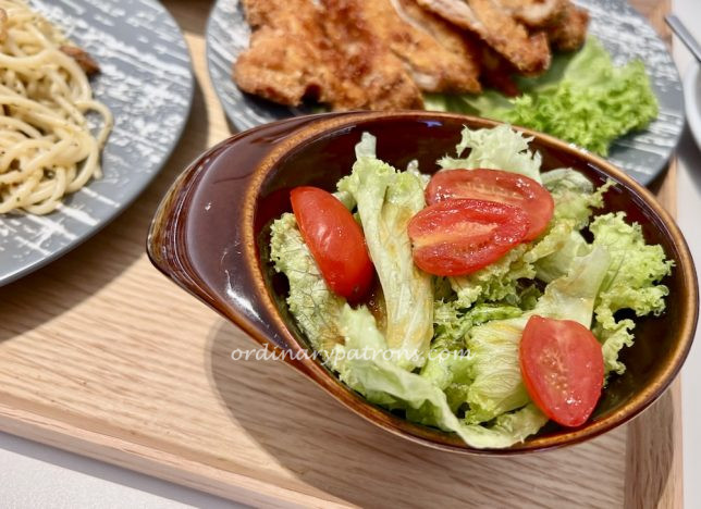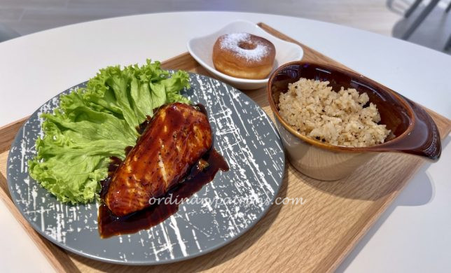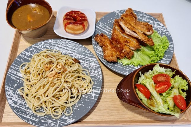 Here are pictures of our lunch. For choice of main course, we tried the chicken katsu curry and salmon teriyaki. Our choice of carbo were garlic rice and aglio olio pasta.