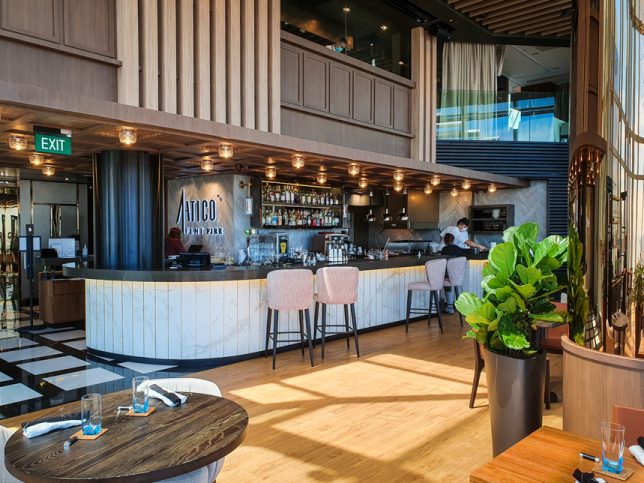 1-ATICO is a visually impressive dining space occupying two levels at the top of ION Orchard. It houses 3 separate dining concepts โ FIRE, an authentic Argentinian restaurant, FLNT, a Japanese-Peruvian Restaurant and Bar, and ATICO Lounge for high-teas and cocktails. Read more.