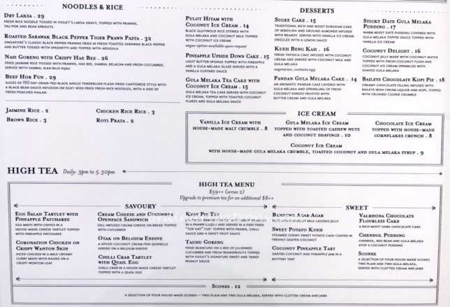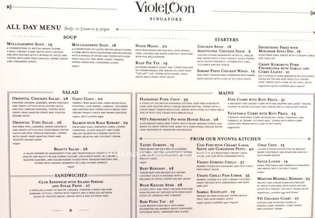 Opened in early 2019, this new outlet of famous Nonya chef Violet Oon serves more than just Peranakan cuisine. Examples of other dishes are local favourites such as chicken rice and Hainanese pork chop and British fare like shepherdโs pie and Mulligatawny soup. Read more.